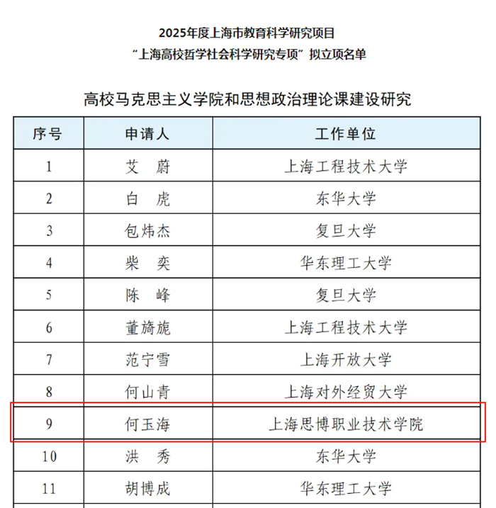 近日,中共上海市教育卫生工作委员会、上海市教育委员会公布了2025年度上海市教育科学研究项目“上海高校哲学社会科学研究专项”立项名单,我校马克思主义学院院长何玉海教授申报的课题在“高校马克思主义学院和思想政治理论课建设研究”项目中成功获批。何玉海教授的这项研究成果,不仅是他学术探索道路上的重要进展,同时是学校在此类课题的一次重要突破,为学校在相关课题研究领域积累了宝贵经验,对后续科研工作的推进具有积极意义。